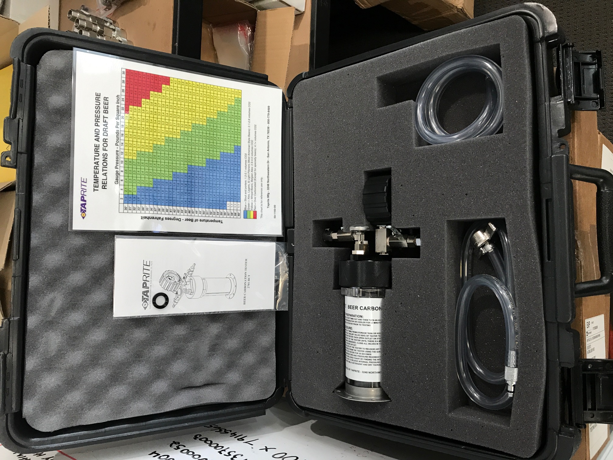 The Taprite Beer Carbonation Tester is designed to be used in the field to verify carbonation levels during equipment installation and keg change-outs. It is a cost effective and accurate tool for troubleshooting and quality control. The Carbonation Tester's sturdy, 11 ounce acrylic canister includes a handy label noting the appropriate CO2 volume based on your temperature and pressure reading. The Tester's cap and fittings are made of lightweight metal with easy to grip knurling. The pressure gauge includes a protective rubber boot (600GPS-01) for additional durability. Taprite's Beer Carbonation Tester is easy to handle, easy to use, and easy to clean. Each Tester comes with a cushioned carrying case, as well as inlet and outlet hoses with quick disconnects.